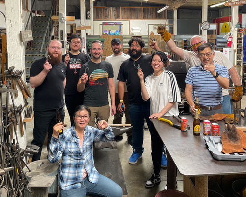 Fire up and empower your group with our blacksmithing experience! No prior knowledge is needed and our experienced instructor will safely take your class through every step in creating your own handmade, utilitarian object like a knife, bottle opener, wall hook, or butter/cheese spreader. Everyone will get to use the forges and anvils, will pound and shape red hot metal, and will get to take home their individual creation. This class is very popular with both men AND women, so don't be afraid if you have a mixed group. It is especially exhilarating for those that have never experienced metal working.